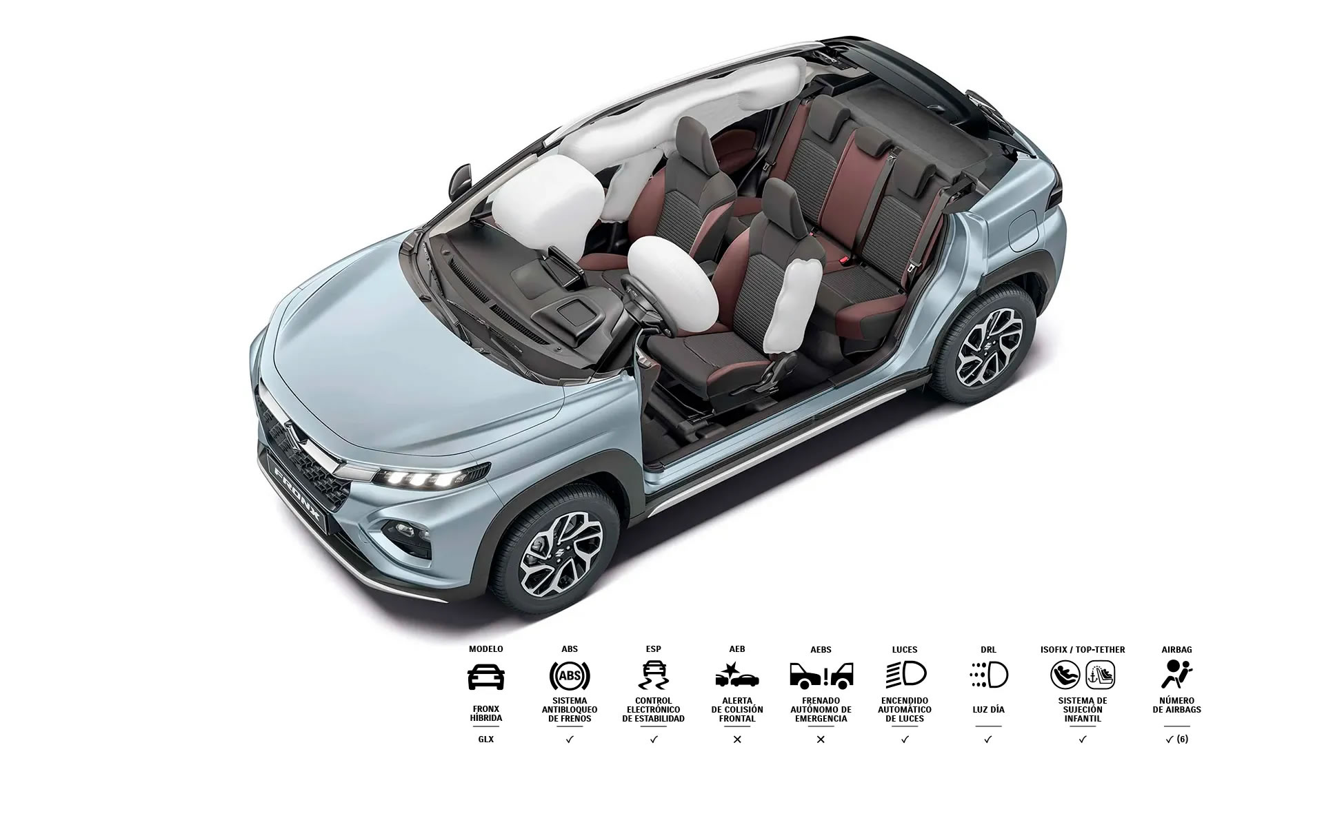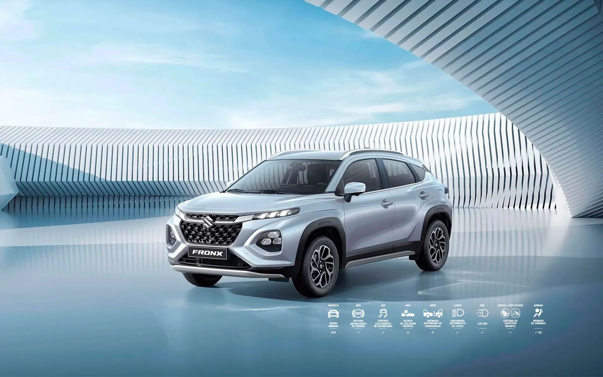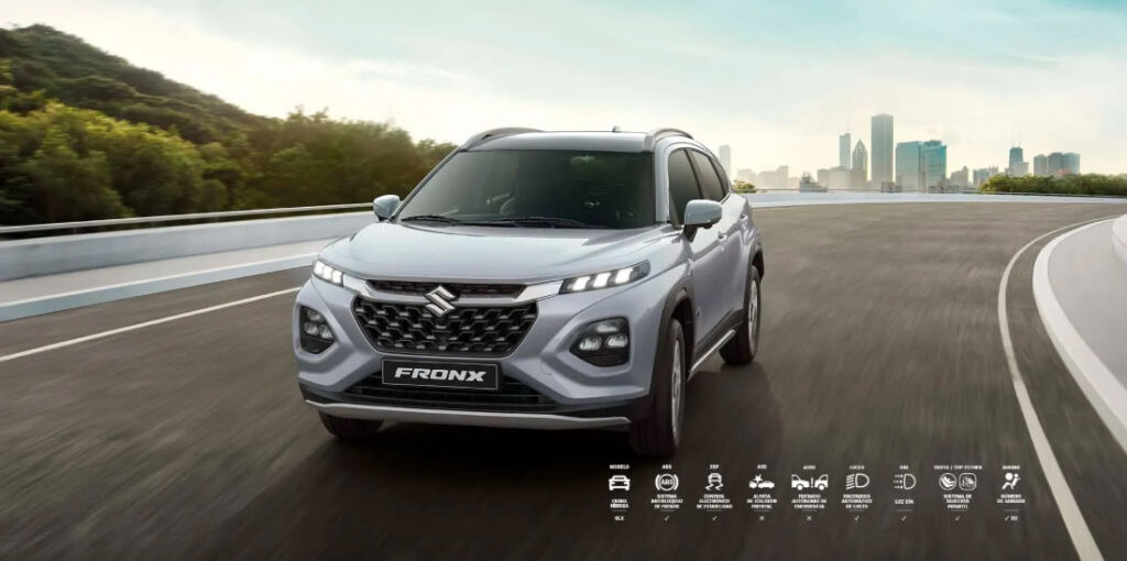 El diseño exterior fusiona la robustez característica de una SUV con elementos modernos y elegantes que hacen que la nueva Suzuki Fronx resalte a donde vayas. En la parte frontal destaca una parrilla amplia e imponente con luces de diseño dividido, mientras que los guardabarros se extienden a lo largo de la carrocería con protectores plásticos de alta resistencia. Además, su altura al piso de 17 cm te da la tranquilidad de conducirla en diferentes terrenos.